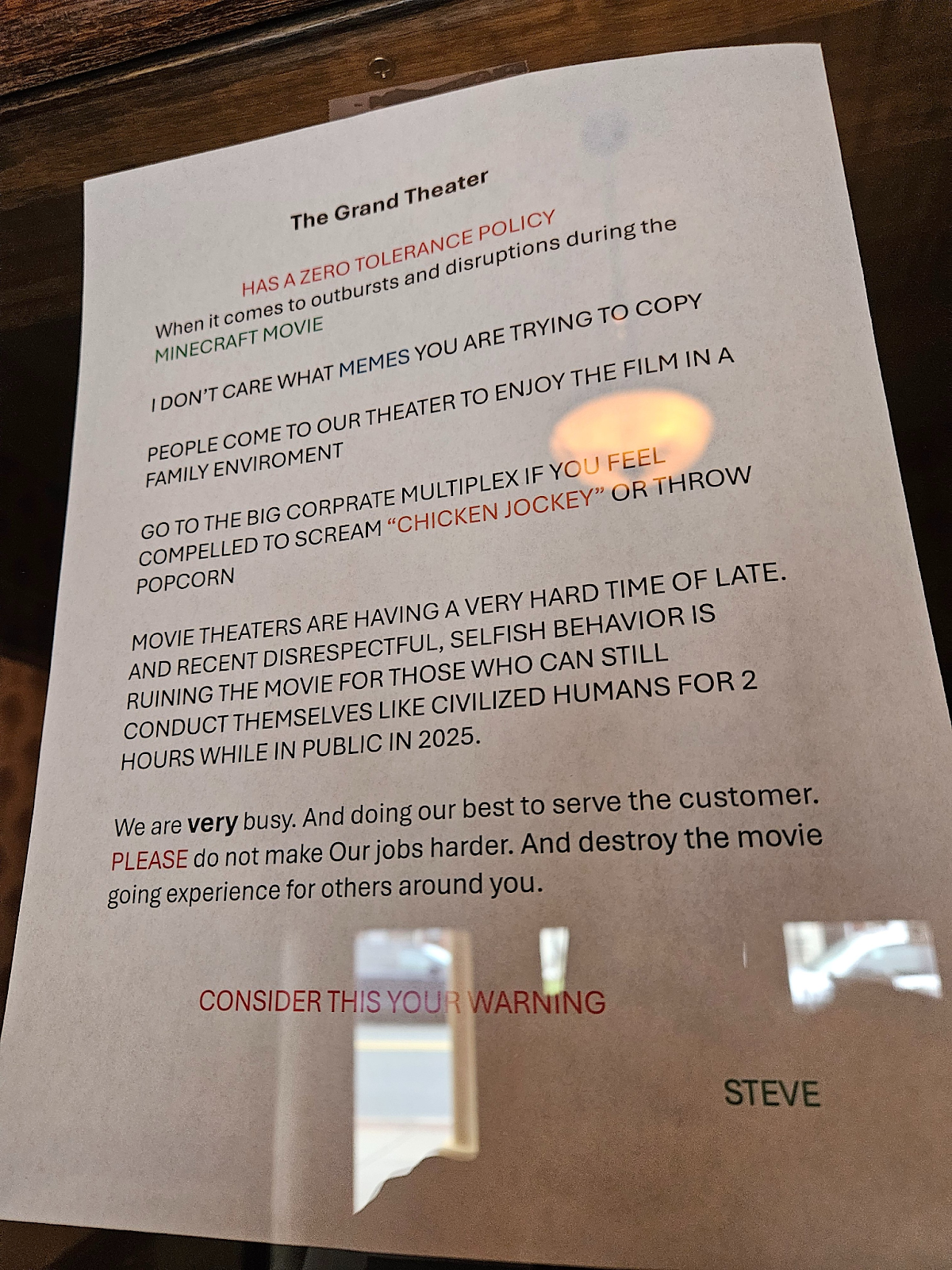 Finally we chatted about how theaters could embrace the insanity of more “interactive” movie screenings like what is happening with Minecraft. They did it with sing-a-long screenings of Wicked, why not with Jack Black’s nightmare? [Note from Zach, I’m an old man and I hate everything about Minecraft but f’n hell if it gets people to go to movie theaters… let’s figure out a way to let the kids get their kicks. I should also note that we had this discussion before Sinners opened. We’ll be revisiting that next week.] Part of the discussion was the Variety story that covered Alamo Drafthouse’s decision to not do the “Second Screen Experience” for the M3GAN rerelease. Both Russ and and I both dream of having an Alamo Drafthouse near us… but Syracuse and Norfolk likely aren’t on their list.